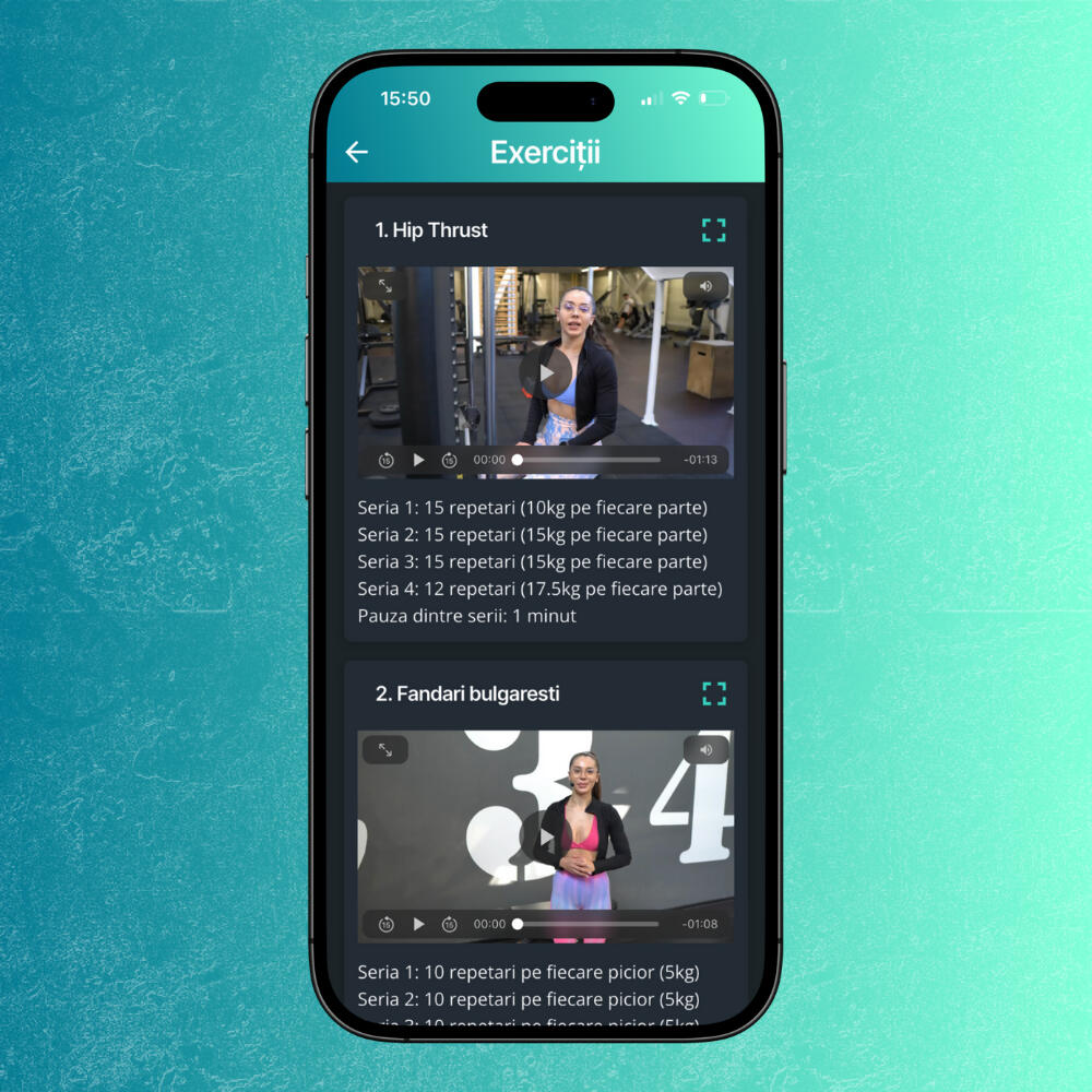 Poți accesa antrenamentele gratuite din cadrul aplicației, iar daca lucrezi cu unul dintre antrenorii parteneri, vei putea accesa programul de antrenament al acestuia