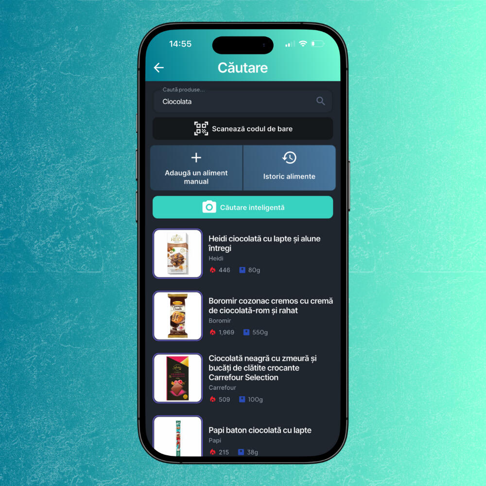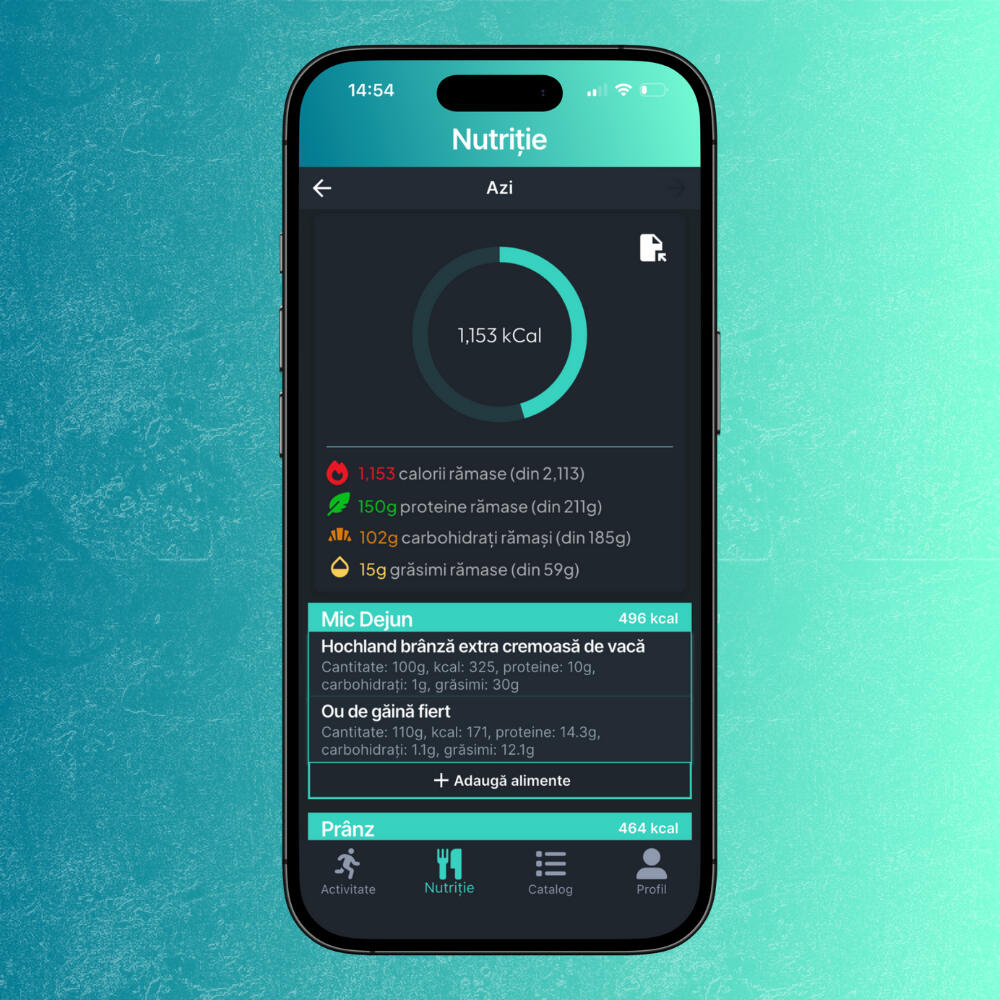 Poți cauta alimente sau mâncăruri în diferite moduri (cauți alimentul în baza noastră de date / scanezi codul de bare al produsului / fotografiezi farfuria și primești valorile nutriționale și gramajul prin AI), apoi setezi cantitatea și adaugi în jurnalul tău alimentar.