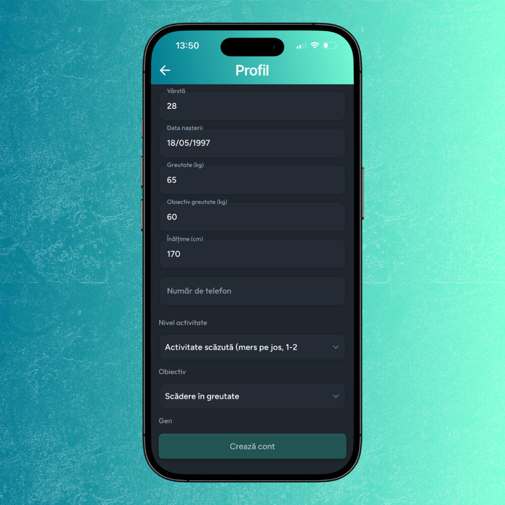 După crearea contului aplicația îți va stabili obiectivele pentru nutriție și activitate în funcție de datele oferite de tine.